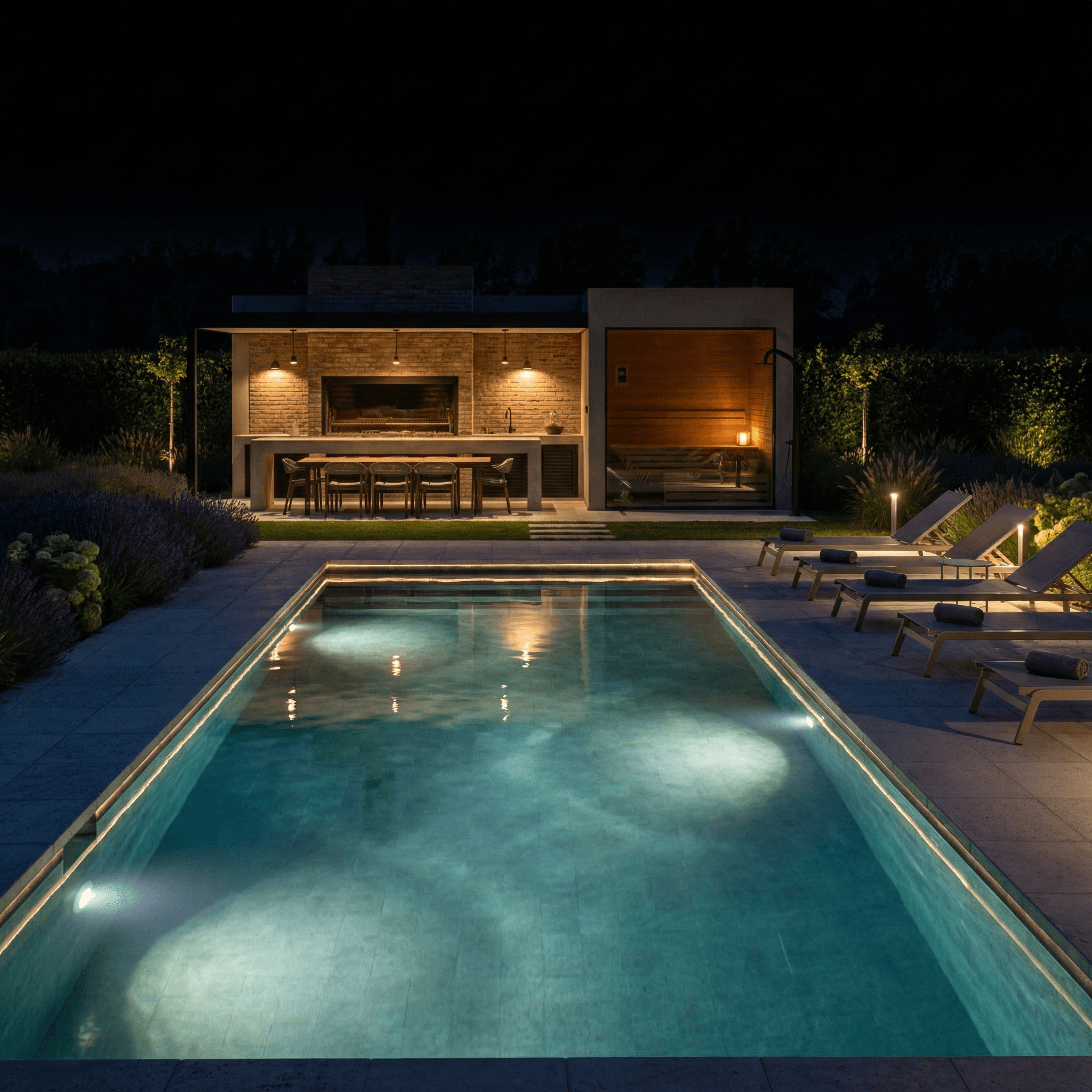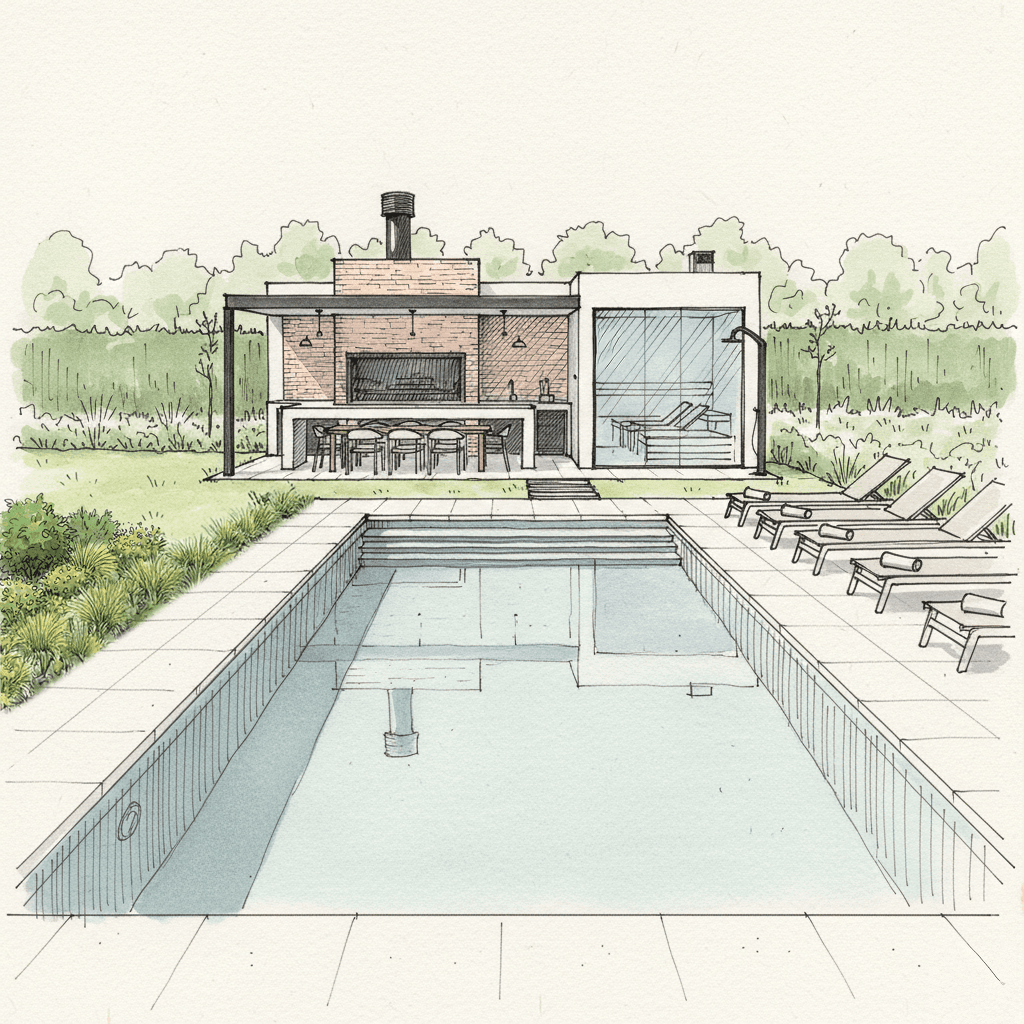 Ejecutamos movimiento de suelo, instalaciones dimensionadas para uso intensivo, impermeabilización, terminación premium y puesta en marcha del sistema. Además, desarrollamos la ducha exterior con desagote y piso antideslizante, vestuarios funcionales y un sauna húmedo con aislaciones, vapor, ventilación e iluminación adecuadas. Coordinamos la obra por etapas para cumplir plazos y mantener el orden del predio.